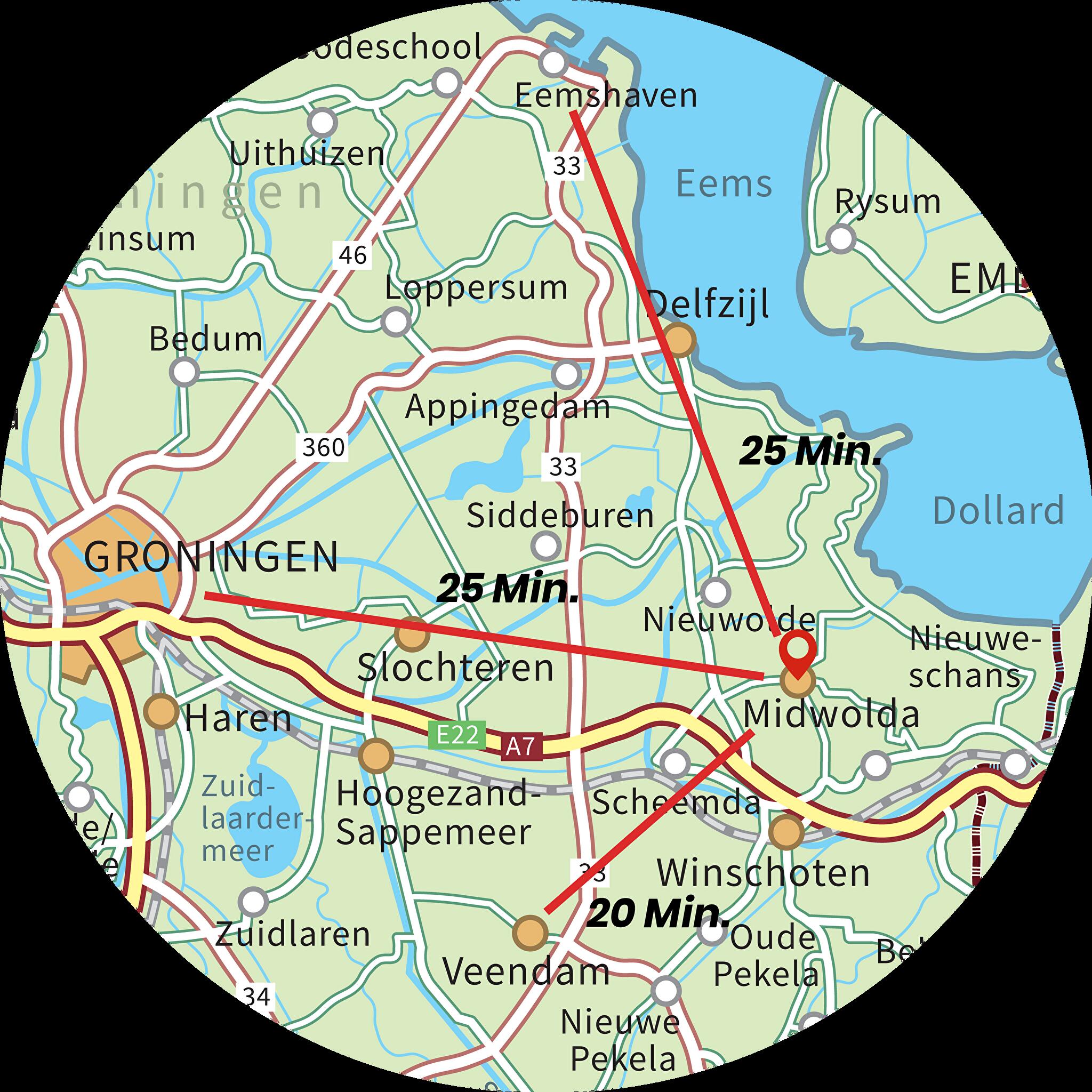 Groningen, Appingedam en Eemshaven binnen +- 25 minuten bereikbaar.
